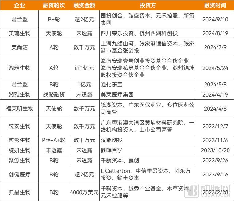 一级市场方面,在融资难大背景下,2023年至今重组胶原蛋白领域共有投融资13起,其中一半在2024年,更有君合盟、湘雅生物等在2024年以来连续完成两轮融资。看好重组胶原蛋白的投资方,除了銘丰资本、千骥资本等大健康领域的专业投资机构外,还包括通化东宝等产业资本。同时,多起融资的单笔交易金额过亿,体现出资本市场对重组胶原蛋白市场的信心。