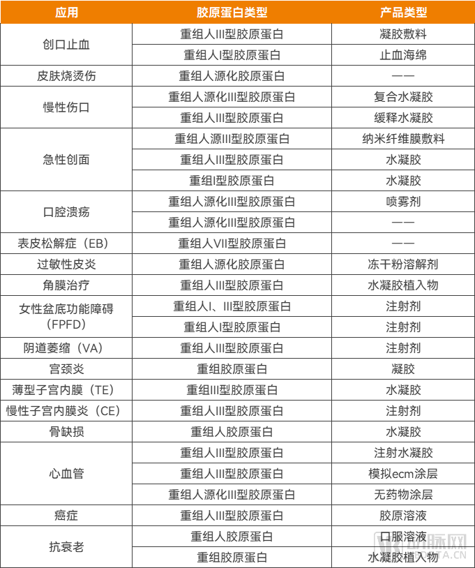 除了医美之外,重组胶原蛋白制成的凝胶、敷料及软膏等成熟产品已用于皮肤烧伤、皮肤创口、皮炎、痤疮及GSM的临床治疗,效果相对于以往治疗方法更显著。