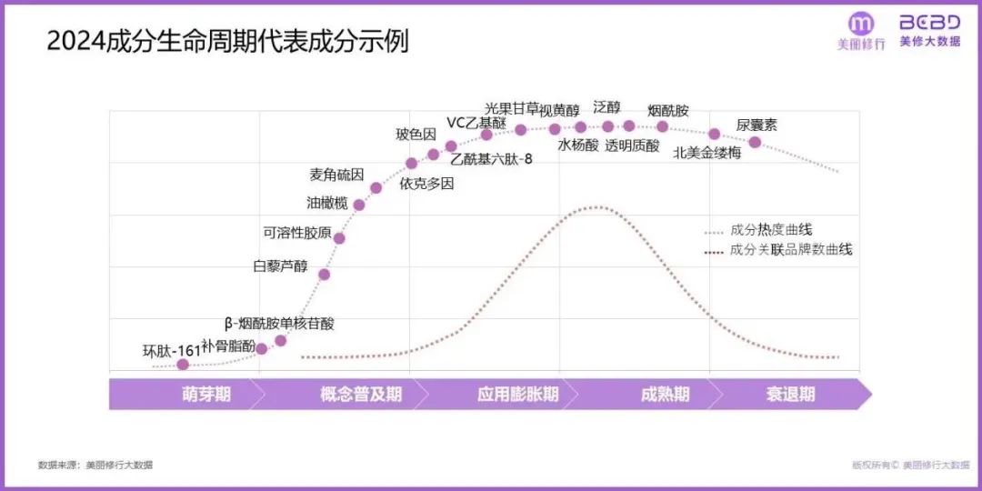 正如每个人、每个产品、每个企业都有“生命周期”,每个成分同样拥有自己的生命周期。根据美丽修行绘制的2024成分生命周期图,水杨酸、泛醇、透明质酸、烟酰胺等4个功效成分,已步入应用成熟期,市场增长动力逐渐减弱。