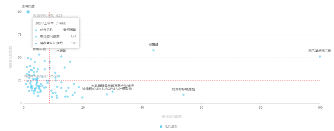 美丽修行热门成分市场空间&消费者认知矩阵也显示,透明质酸的消费者认知指数已达100(消费者认知指数越大,则该成分认知越深),市场空间指数仅有1.47(市场空间数值越小,该成分的市场空间越小)。也就是说,对于透明质酸,虽然消费者认知高,但市场已经饱和。