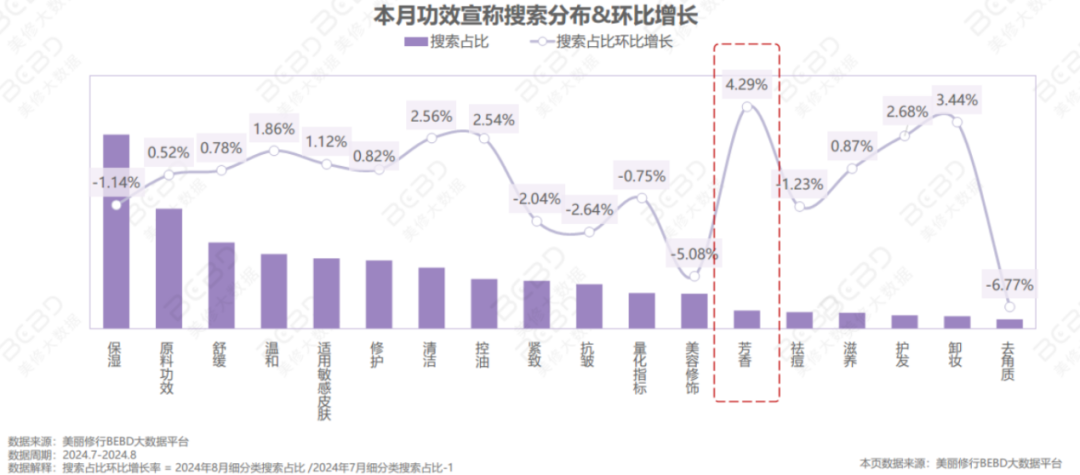 在市场端,消费者越来越倾向于使用芳香类产品,提升护肤体验和整体舒适感,就在8月,芳香类功效宣称搜索占比环比增长位列第一,迷迭香(ROSMARINUS OFFICINALIS)叶油、檀香(SANTALUM ALBUM)油、柚(CITRUS GRANDIS)果皮油、香叶天竺葵(PELARGONIUM GRAVEOLENS)提取物等天然香料,也关注度飙升。