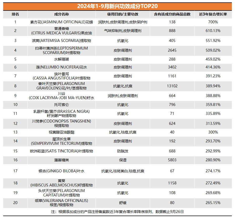 02、新兴成分TOP20:植物成分霸榜,概念普及迫在眉睫