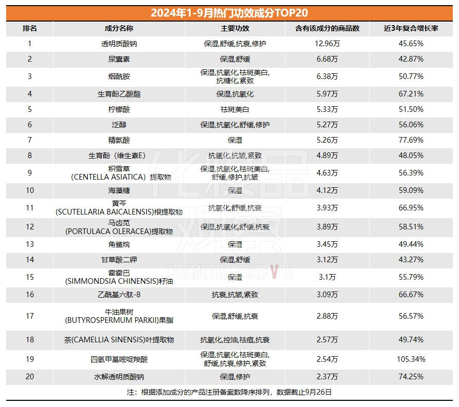 以透明质酸(又称玻尿酸)为例,作为保湿标杆成分,其衍生物也一直备受关注,但备案增速逐渐放缓。2024年1-9月,透明质酸钠以12.96万件关联新品,跻身热门成分榜第一,但近3年复合增长率为45.65%,增速不及位居TOP20的水解透明质酸钠,后者2024年以来备案量达2.37万件,近3年复合增长率为74.25%。