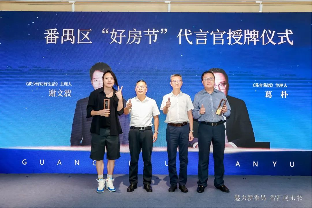 同时,为了宣传番禺区域优势、增加“好房节”的活动影响力,本次活动还邀请了《波少好房好生活》波少、《葛言葛语》葛朴两位自媒体主播大咖为番禺区代言,并由曹万里主任、陈舜展书记为他们颁发了“代言官”牌匾。