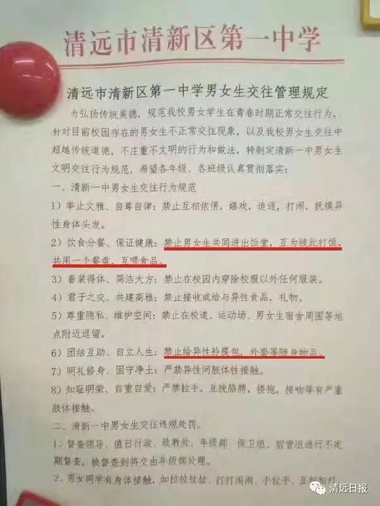 据金羊网报道,近日,网传清远清新一中发布“史上最严‘男女交往校规’”——男女生共同进出食堂、给异性拎包拿外套等行为皆被“禁止”。
