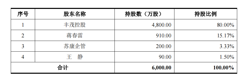 丰茂投资直接持有丰茂股份60%股权,为公司控股股东。天眼查显示,丰茂投资则由蒋春雷、王静、蒋淞舟三人完全控股。其中,蒋淞舟直接持有丰茂投资33%股权,以丰茂股份目前市值计算,蒋淞舟个人身家便超过5.7亿元。