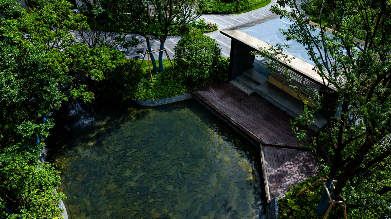 经过人脸识别系统,走进小区内部,大面积水景打造,高浓度林荫景观,将写意东方的设计理念完美展现在眼前。屏风、珠帘、亭台……有别于传统园林大面积草坪覆盖,移步异景,“一池三山”的自然风貌栩栩如生。