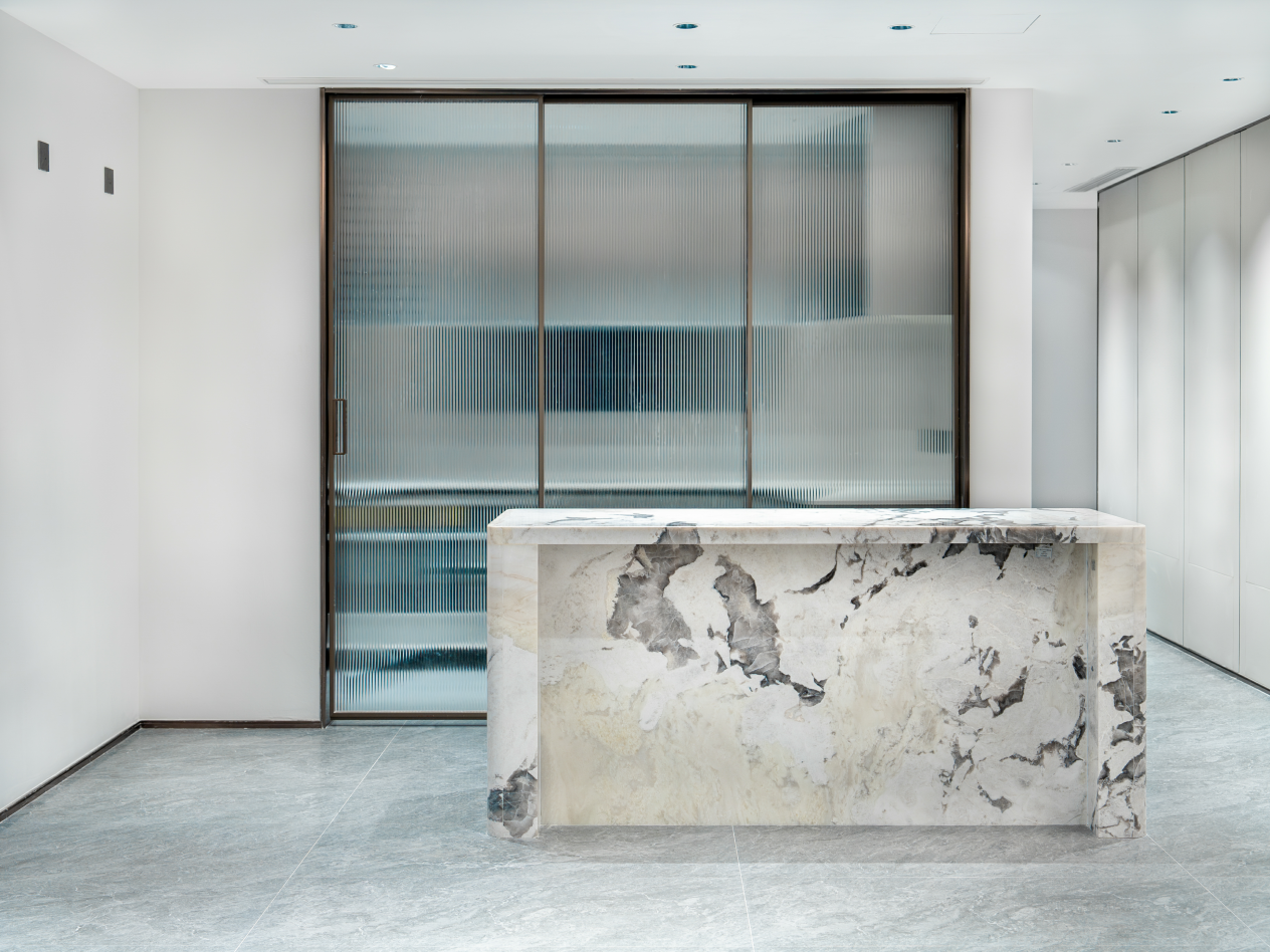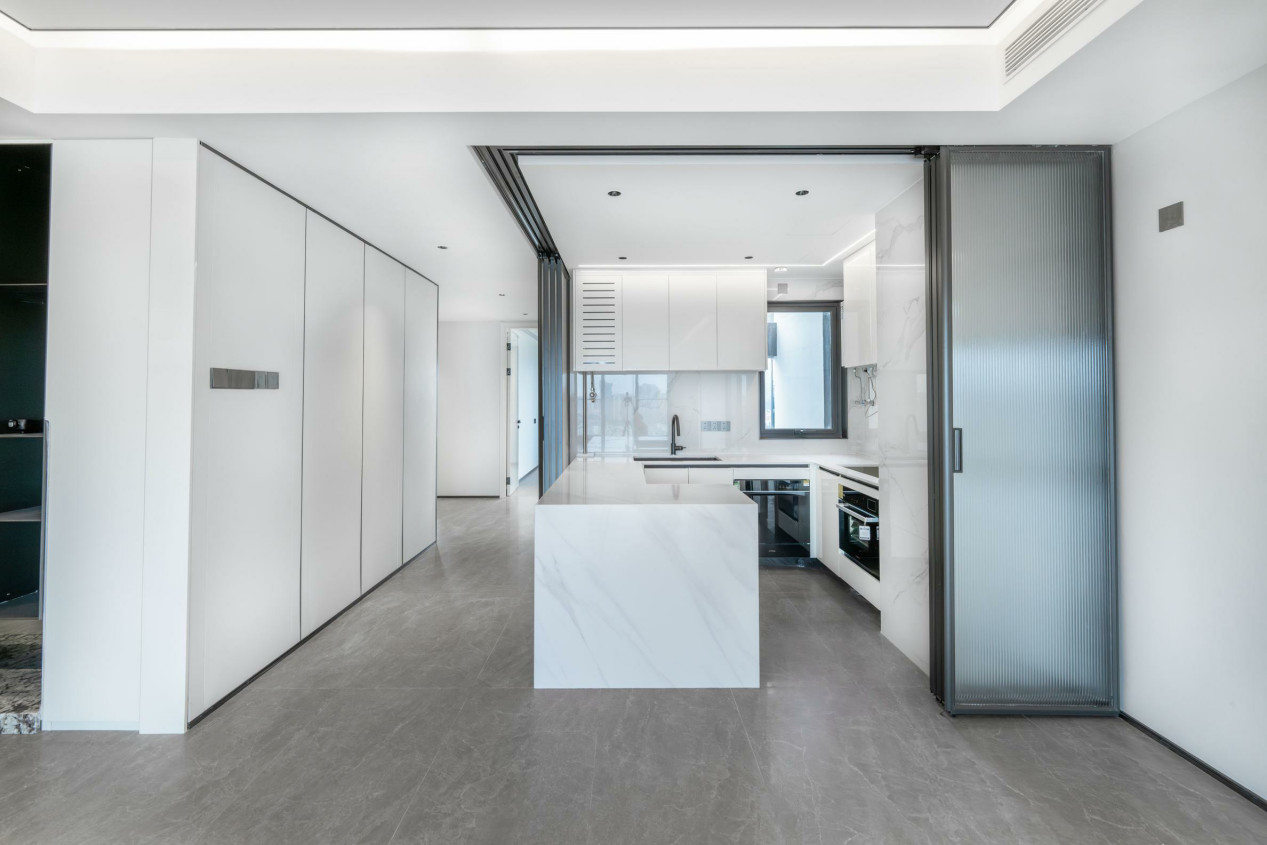 玄关台面,主卧、卫生间台面及岛台,均采用整块意大利进口奢石芬迪白,不规则的灰色与白色晶体漂移挥洒在板面上,内部黑色水晶优雅又高级。