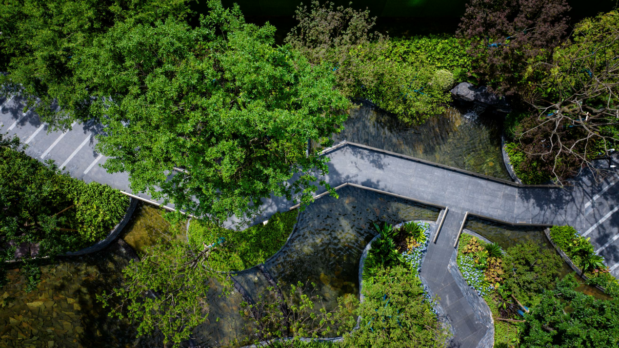 依水栽植的8-12m高大乔木,大部分都是全冠大树,科学搭配的树种,高矮植层层叠叠,成峦叠翠间,溪水潺潺,将盘龙江的自然风貌,通过大面积笔墨铺设水景,引江入园。