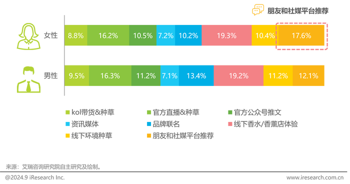 值得注意的是,女性消费者相比男性消费者来说,更容易被朋友的口碑推荐及抖音、小红书等社交媒体平台种草。
