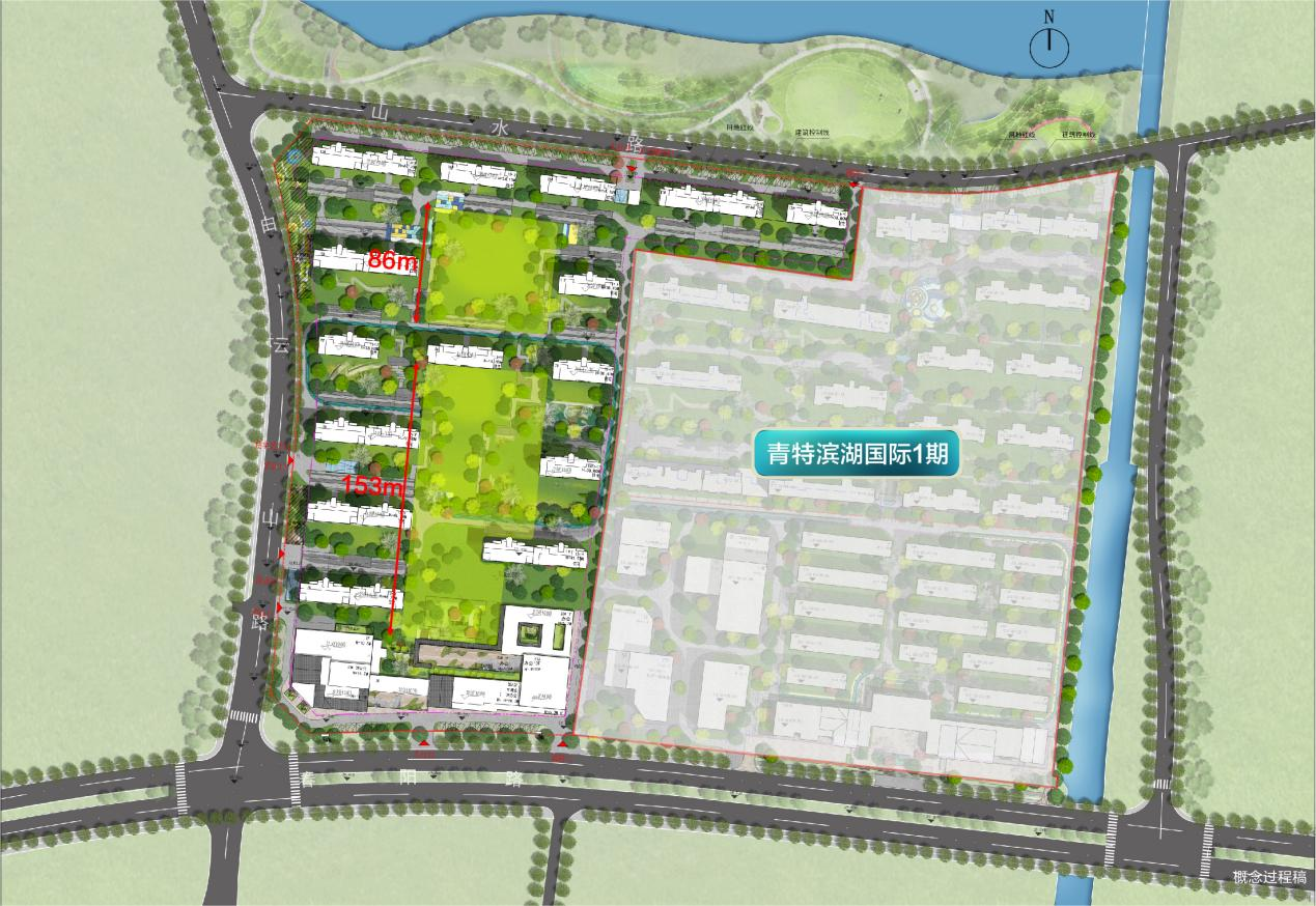 在整盘规划上,滨湖国际2期为了最大限度保证生活的舒适度,两次拔掉楼,退让出约12000㎡中庭景观,实现最大约86-153米的开阔楼间距,将更多土地,让步于景观与公共空间,将更多绿化还给生活。