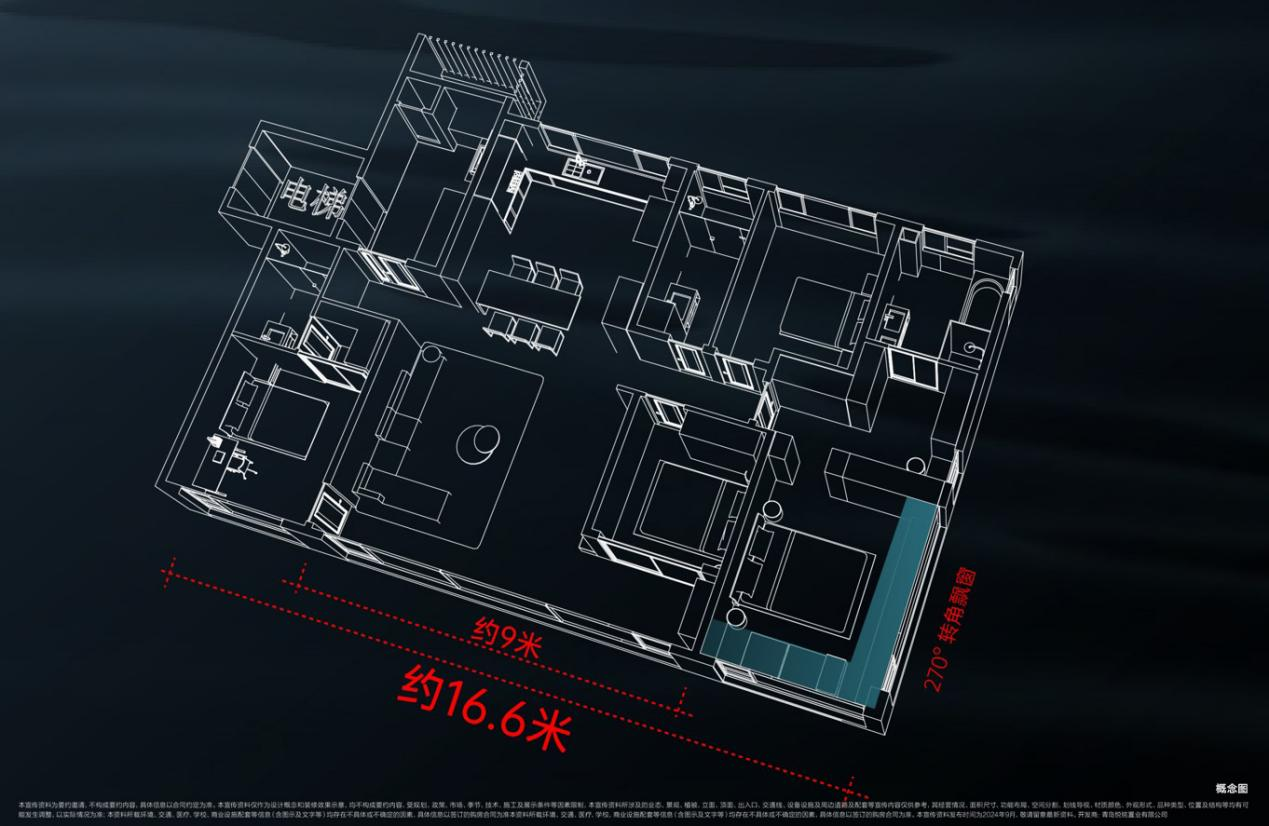 产品的户型设计无疑是整场发布会的亮点。以建面约160㎡的户型为例,不仅可以实现约9米观景阳台,约16.6米南向大面宽,约270°转角窗设计,超值的使用面积足以与市面上建面约180㎡的户型相媲美,展现了青特置业设计团队对空间利用的执着追求。