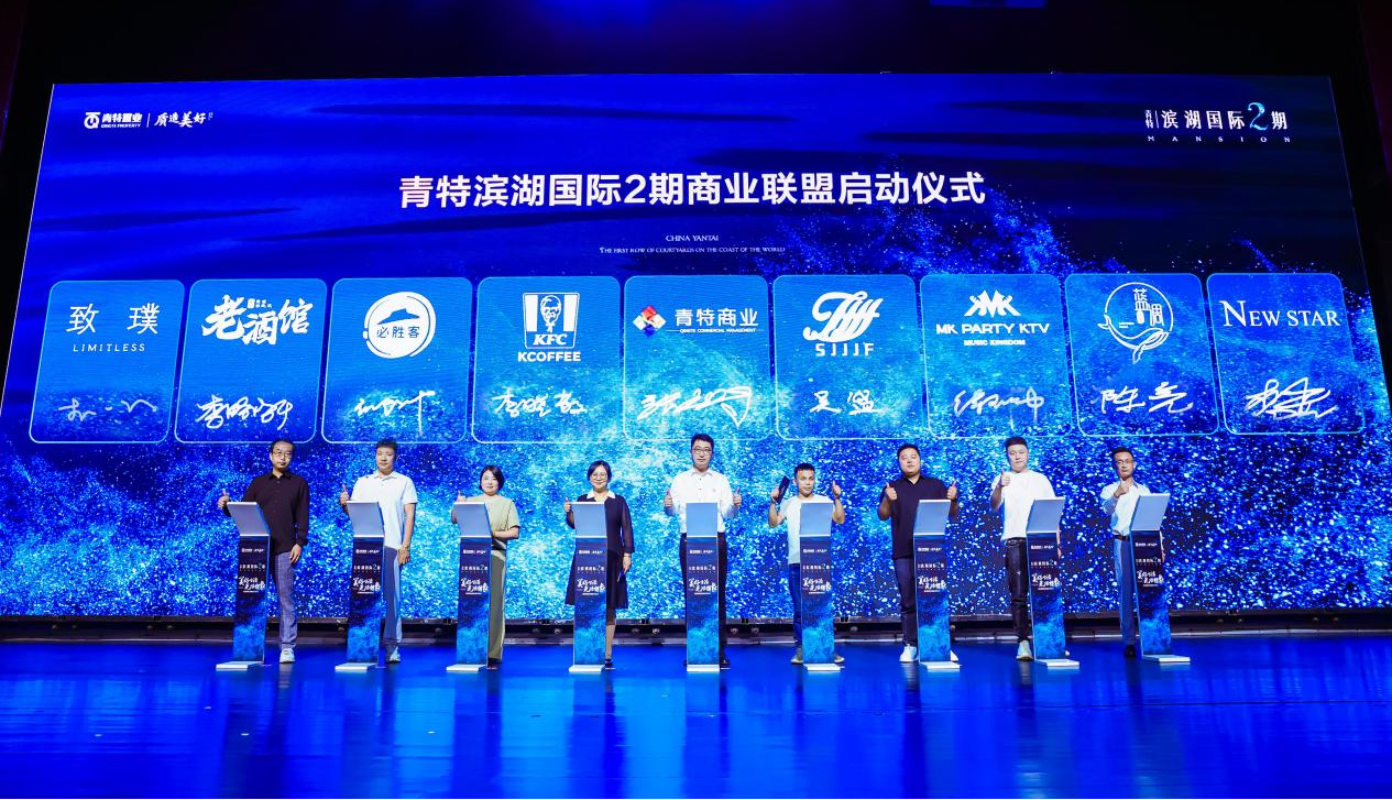 在盛典现场,肯德基、必胜客、致璞咖啡、老酒馆、世纪家家福超市、MK PARTY KTV、蓝调电竞、纽斯温泉8大品牌商家代表共同登台,与青特商业一起启动青特商家战略联盟,未来期待合作提前呈现繁华精彩的商业场景,演绎滨湖生活的万千精彩。