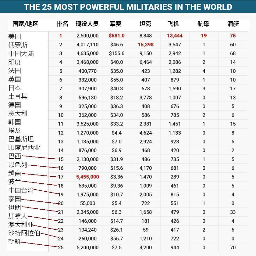 这里根据全球火力指数制作了一张25支军事力量的实力对比。该排名发布于2016年4月,它包含有一套复杂的数据,也会受到变动中的国际局势的影响。