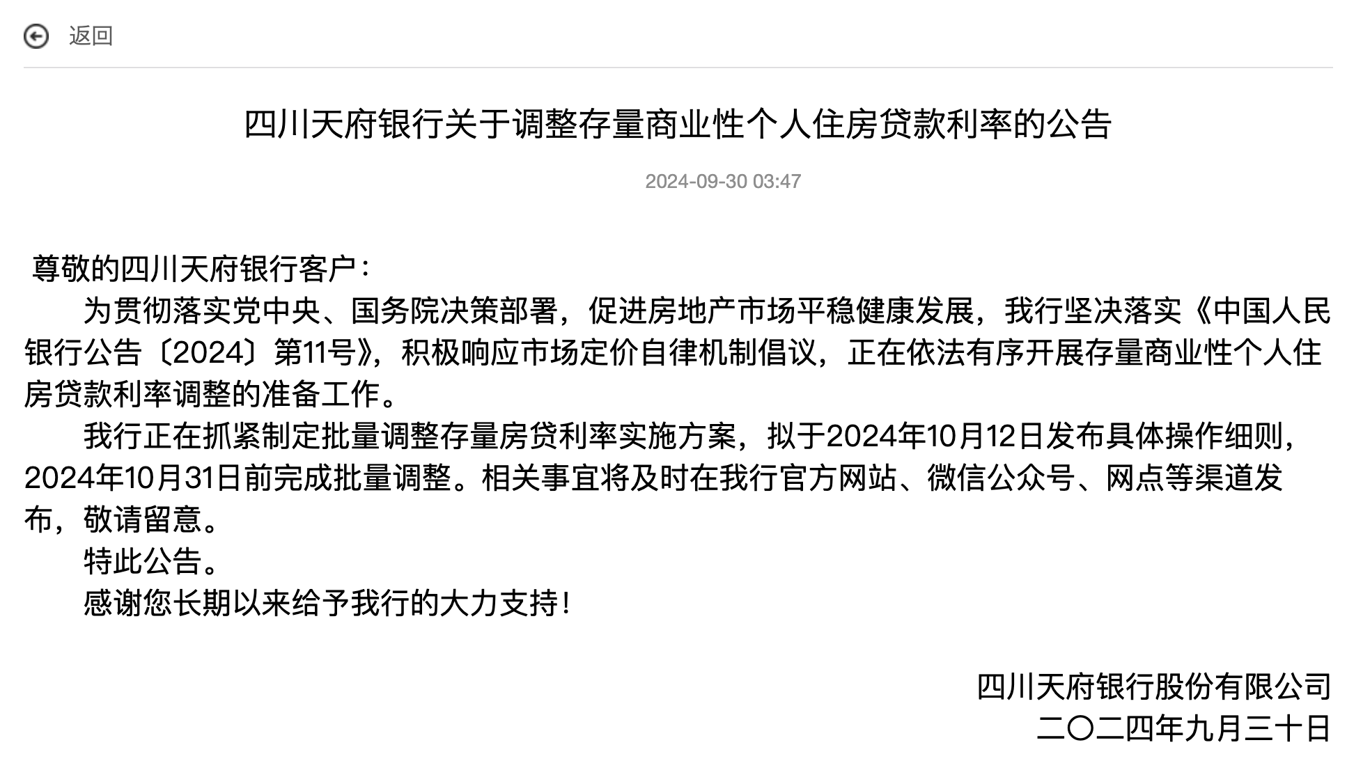 9月30日,四川天府银行发布关于调整存量商业性个人住房贷款利率的公告,该行正在抓紧制定批量调整存量房贷利率实施方案,拟于2024年10月12日发布具体操作细则,2024年10月31日前完成批量调整。