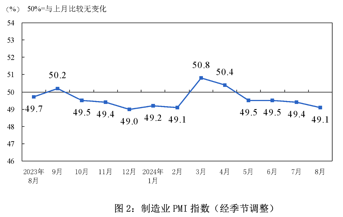 最近一段时间,我国消费者信心指数整体较为低迷,尤其是2022年4月出现大幅下滑,此后基本处于90以下的区间,2024年6月仅为86.2(图1)。同时,我国PMI指数也长期位于50%的荣枯线以下(图2)。这表明制造业生产经营扩张的进程放缓,企业的预期和信心尚未得到有效恢复,实体经济回升向好的基础仍不牢固。