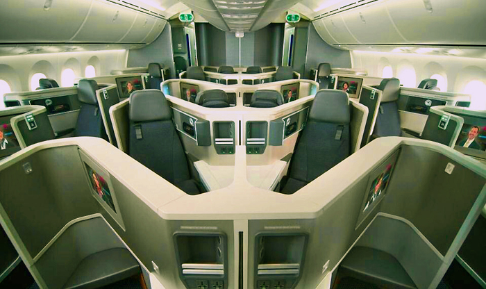 近年来最为流行的商务舱座椅布局,恐怕非“反鱼骨”莫属,其排布依然是1-2-1布局,4列座位的形状有如两根倒过来的鱼骨。不像北极星采用的交错排列,而是以座位间彼此相对的倾斜角度从而令乘客的头、脚朝向一致,但仍保持每个座位基本正向。同时,靠窗的座椅因朝窗户一边微微侧向,使想要观景的乘客更为方便。这也是目前受到好评最多的商务舱座椅,国泰航空的波音777-300ER、美国航空与荷兰皇家航空的波音787-9等商务舱均采用这样的设计。