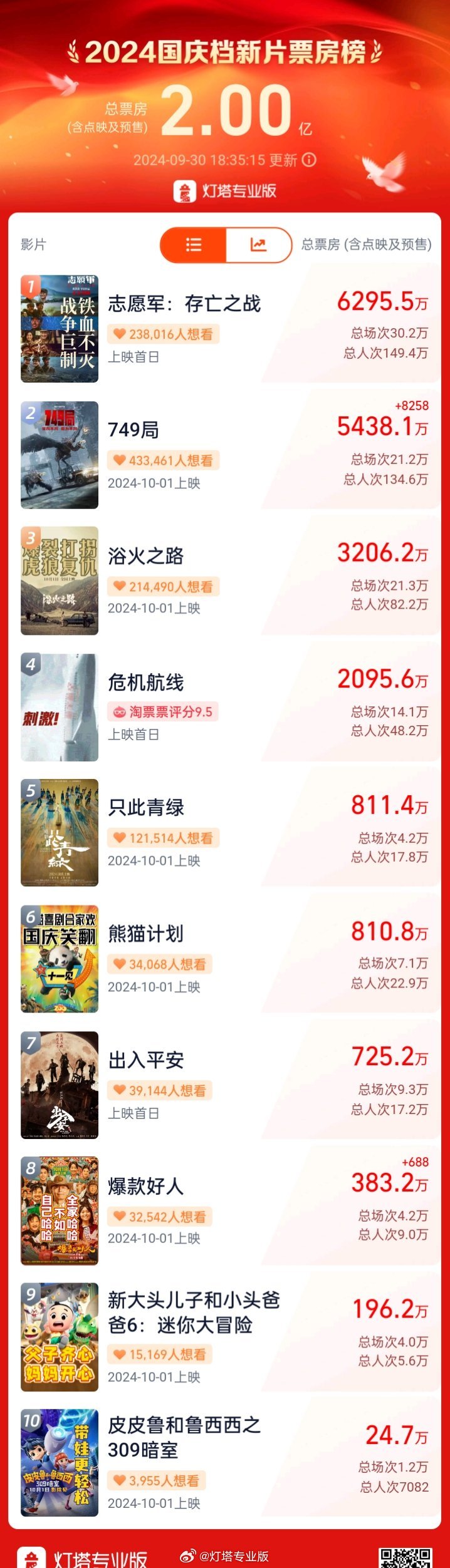 据灯塔专业版,截至9月30日18时35分,2024年国庆档新片票房(含点映及预售)突破2亿元。