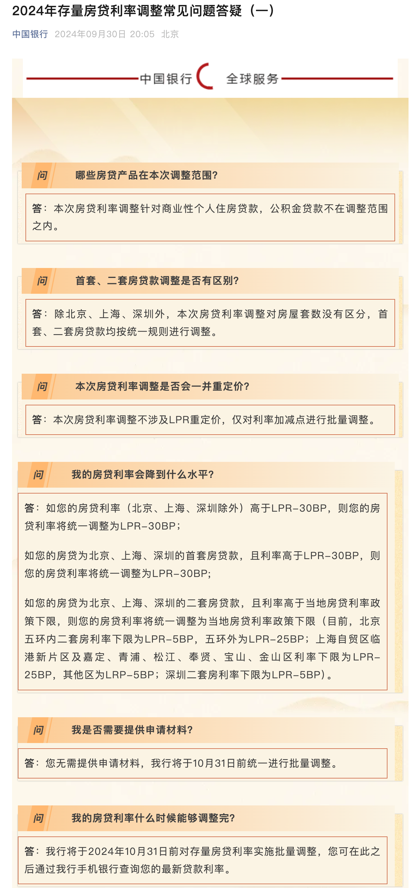 9月30日,中国银行发布《2024年存量房贷利率调整常见问题答疑(一)》。其中提及,除北京、上海、深圳外,本次房贷利率调整对房屋套数没有区分,首套、二套房贷款均按统一规则进行调整。本次房贷利率调整不涉及LPR重定价,仅对利率加减点进行批量调整。如房贷利率(北京、上海、深圳除外)高于LPR-30BP,则将统一调整为LPR-30BP;如房贷为北京、上海、深圳的首套房贷款,且利率高于LPR-30BP,则将统一调整为LPR-30BP;如房贷为北京、上海、深圳的二套房贷款,且利率高于当地房贷利率政策下限,则将统一调整为当地房贷利率政策下限(目前,北京五环内二套房利率下限为LPR-5BP,五环外为LPR-25BP;上海自贸区临港新片区及嘉定、青浦、松江、奉贤、宝山、金山区利率下限为LPR-25BP,其他区为LRP-5BP;深圳二套房利率下限为LPR-5BP)。无需提供申请材料,银行将于10月31日前统一进行批量调整。