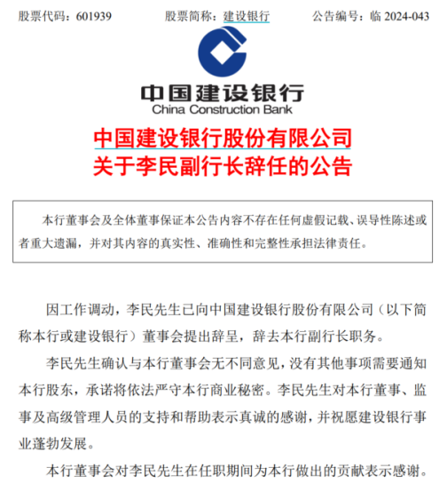 9月18日,建设银行(601939.SH/0939.HK)发布公告称,因工作调动,李民已向董事会提出辞呈,辞去副行长职务。