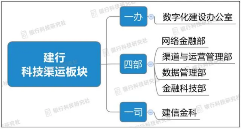 在2022年报中,建行首次界定了“科技渠运板块”。其下设“一办四部一司”(数字化建设办公室,网络金融部、渠道与运营管理部、数据管理部、金融科技部,建信金科)。