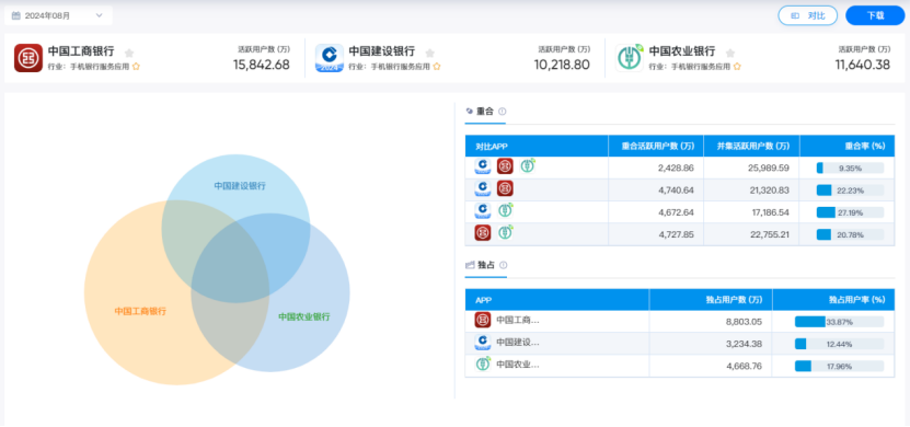 易观千帆的数据显示,2024年8月,建行APP活跃用户数量为10218.8万人,少于工行的15842.68万人和农行11640.38万人。