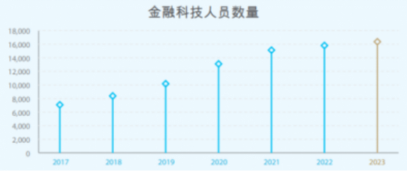 自2018年4月起推进金融科技战略的六年间,建行在金融科技领域累计投入超1200亿元,占收入比重逐渐超过3%。金融科技从业人员,也从6983人暴增超过16000人。