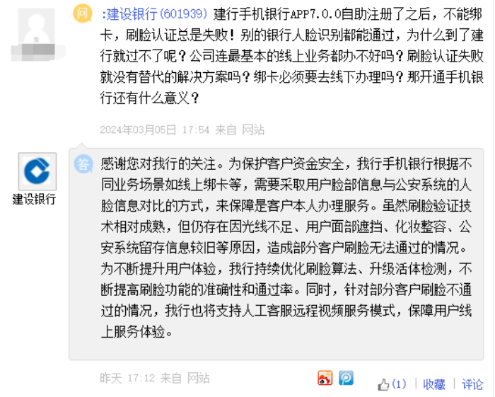 对此,建行官网回复称,由于系统交易量突增,恢复期间会造成个别客户短时交易失败。