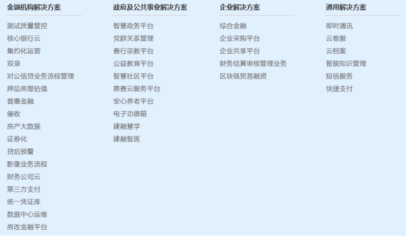 从官网信息看,除了服务建行数字化转型和科技系统建设,建信金科还对外开展智慧金融等多领域的科技服务,并向中小金融机构输出技术、系统和企业级架构等解决方案。