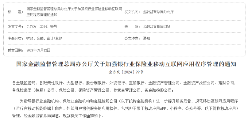 9月14日,国家金管局发布《关于加强银行业保险业移动互联网应用程序管理的通知》,要求金融机构开展移动应用全生命周期管理,有效规范金融机构移动应用的建设管理工作,提升金融机构移动应用安全保障水平和金融服务水平。