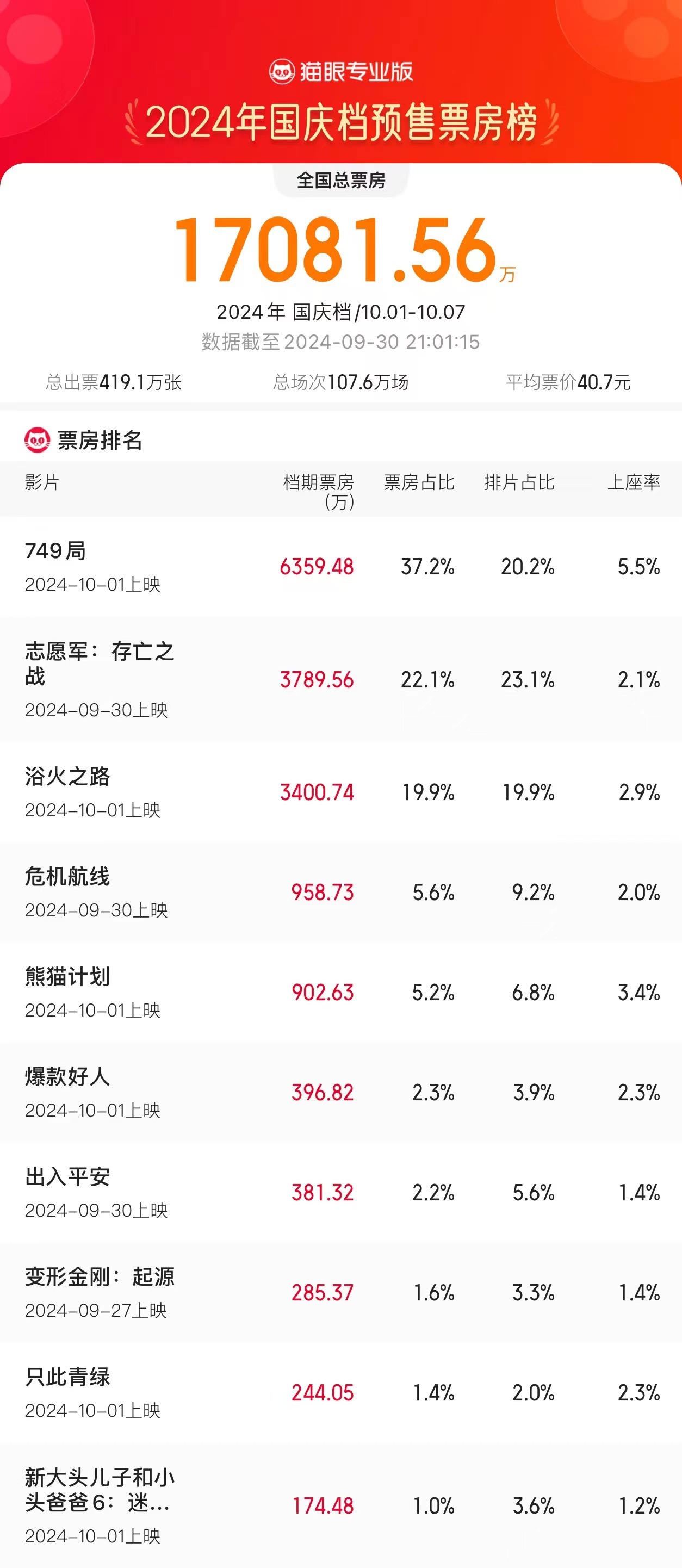据猫眼专业版数据,截至21时,2024国庆档预售票房1.70亿元,预售总人次419万人,总场次107.6万,平均票价40.7元,《749局》《志愿军:存亡之战》《浴火之路》分列国庆档档期预售票房榜前三位。