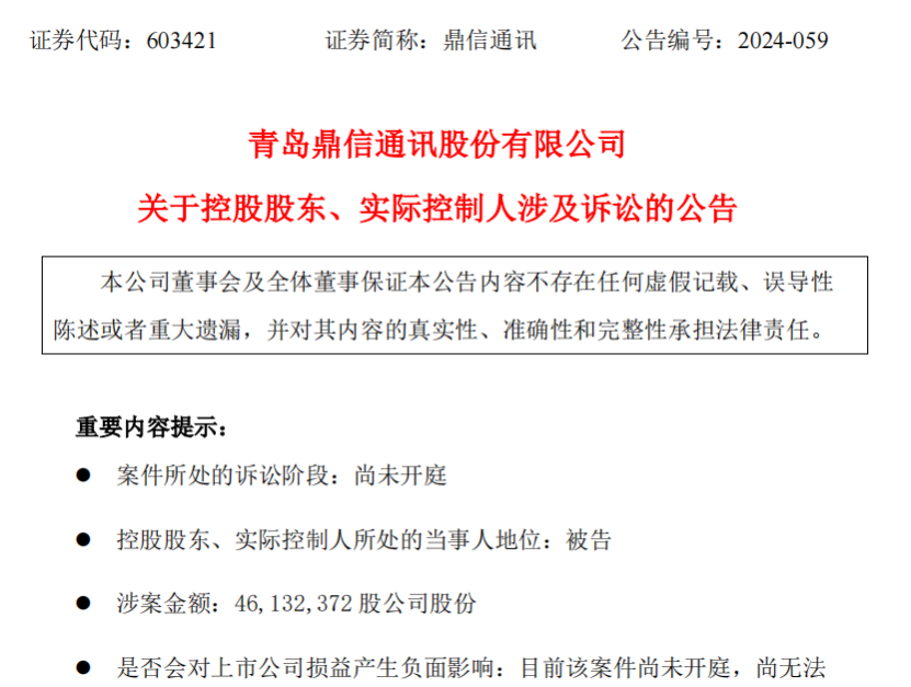 9月26日,鼎信通讯发布公告,称收到控股股东、实际控制人王建华通知,其前妻张启将其诉至法院,要求解除前期离婚协议中约定的股份代持协议,并确认该股份由张启所有,涉及的股份达4613.24万股。