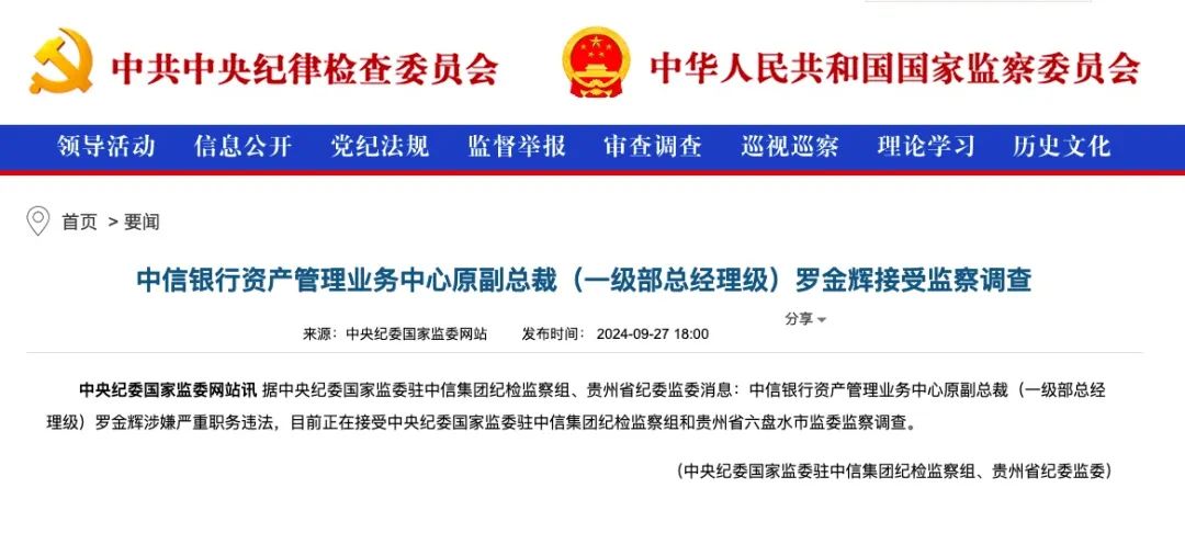 9月27日,据中央纪委国家监委网站披露,中信银行资产管理业务中心原副总裁(一级部总经理级)罗金辉涉嫌严重职务违法,目前正在接受中央纪委国家监委驻中信集团纪检监察组和贵州省六盘水市监委监察调查。