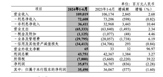 该行“新三年”的首份半年度业绩已经“出炉”,根据2024年中报数据,中信银行总资产为9.1万亿元,同比增长3.07%;营业收入1090.19亿元,同比增长2.68%;净利润354.9亿元,同比小幅下滑1.6%,在股份制银行中位列第3。