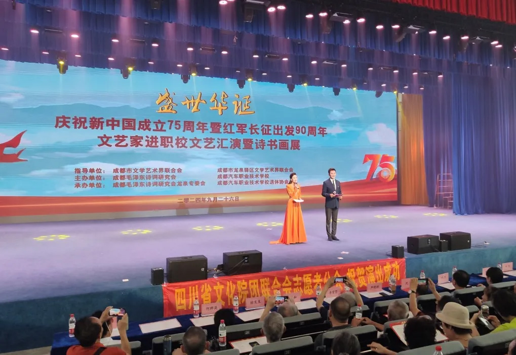 在中华人民共和国成立75周年之际,适逢龙泉驿区职业教育创办40周年,9月26日,由龙泉驿区文联、成都市毛泽东诗词研究会、成都汽车职业技术学校联合主办的“迎国庆,颂长征——文艺家进职校”活动在成都汽车职业技术学校成功举办。本次盛会以多样丰富的文艺形式,共庆祖国华诞。