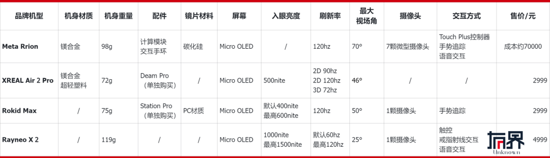 ▲国内主流AR产品与Meta Orion的对比,制图:有界UnKnown