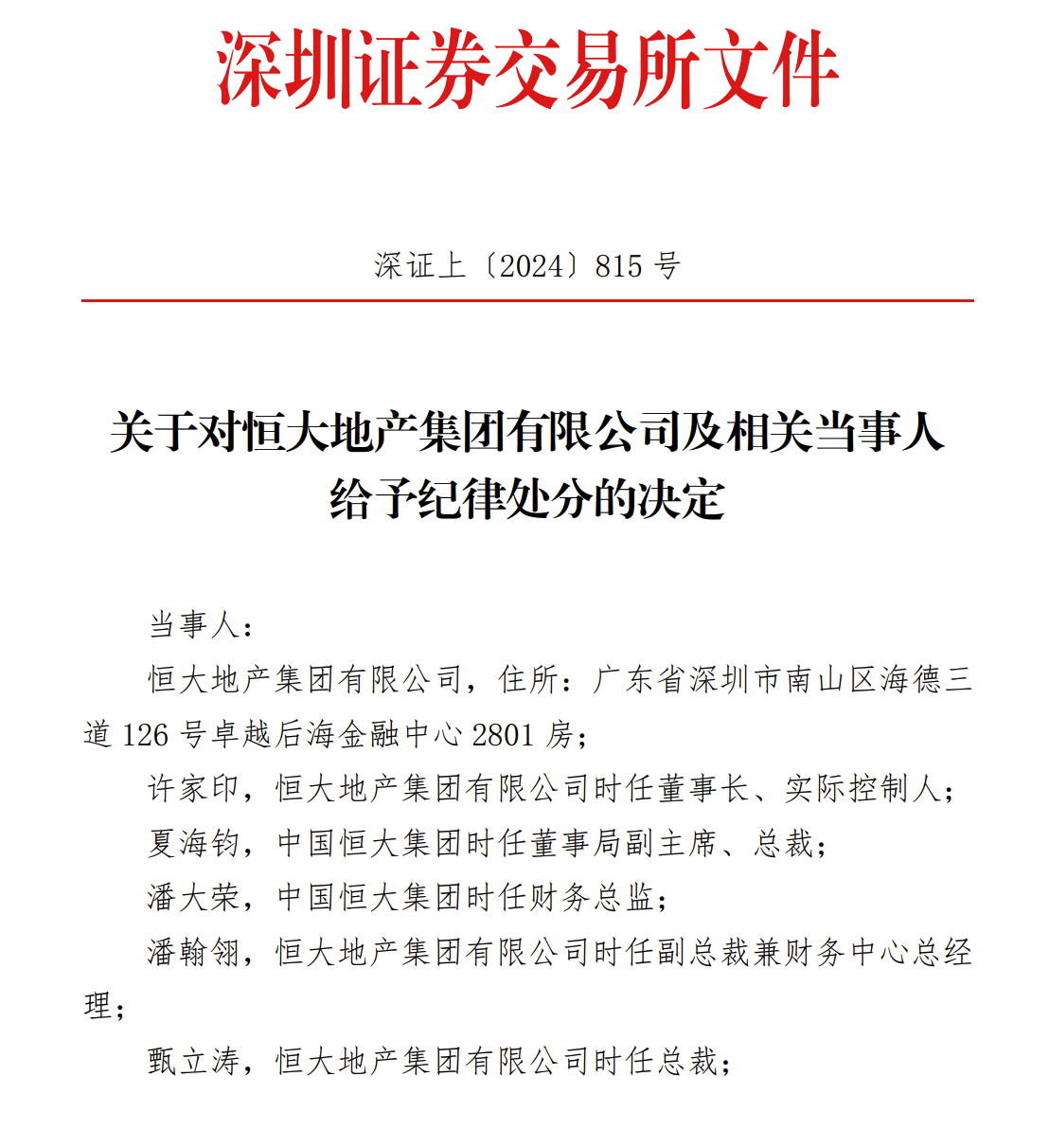 9月30日,深交所发布关于对恒大地产集团有限公司及相关当事人给予纪律处分的决定,深交所决定对恒大地产集团有限公司给予三年不接受提交的债券发行上市申请文件或者挂牌转让申请文件的处分。对恒大地产集团有限公司时任董事长兼实际控制人许家印、控股股东中国恒大集团时任董事局副主席兼总裁夏海钧给予公开认定终身不适合担任债券发行人董事、监事、高级管理人员的处分;对控股股东中国恒大集团时任财务总监潘大荣、恒大地产集团有限公司时任副总裁兼财务中心总经理潘翰翎给予公开认定十年不适合担任债券发行人董事、监事、高级管理人员的处分。上述人员在认定期间内,除不得继续担任原债券发行人董事、监事、高级管理人员职务外,也不得担任其他债券发行人的董事、监事、高级管理人员职务。对恒大地产集团有限公司给予公开谴责的处分。对恒大地产集团有限公司时任董事长兼实际控制人许家印、时任副总裁兼财务中心总经理潘翰翎、时任总裁柯鹏及甄立涛,时任总裁助理兼副总裁兼财务中心总经理钱程、时任董事长兼总经理赵长龙,控股股东中国恒大集团时任董事局副主席兼总裁夏海钧、时任财务总监潘大荣给予公开谴责的处分。