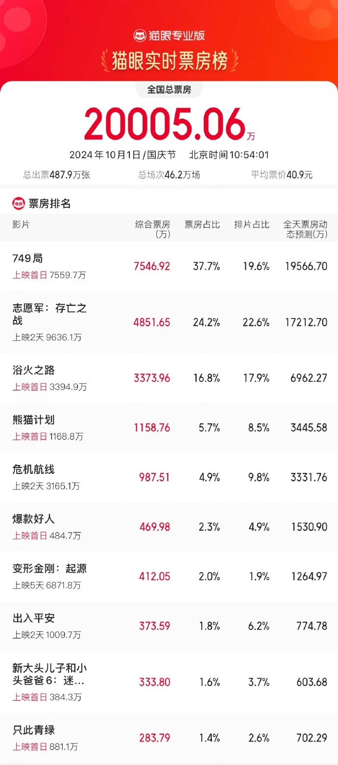 据猫眼专业版数据,截至10月1日10时54分,2024年国庆节(10月1日)大盘票房破2亿,《749局》领跑国庆节单日票房榜。
