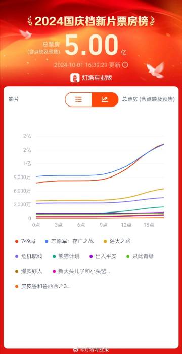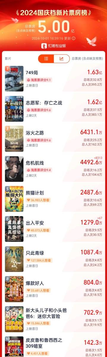 据灯塔专业版,截至10月1日16时39分,2024年国庆档新片票房(含点映及预售)突破5亿。