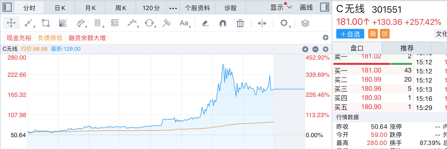盘面显示,无线传媒的发行价格9.4元/股,首日以30.25元/股开盘,收于39.37元/股,涨幅318.83%。9月27日,无线传媒再涨28.63%,收盘价50.64元/股。9月30日,大量资金涌入无线传媒,股价两度因为涨幅过大,出现盘中临时停牌。30日下午14时11分左右,无线传媒上摸249.98元/股,盘中涨幅达到了393.64%,最终收于181元/股,涨257.42%。以181元/股算,已是9.4元/股发行价的约19倍。