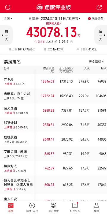 据猫眼专业版数据,截至2024年10月1日19时9分,2024年国庆节票房破4.307亿,超去年国庆节票房成绩,进入影史国庆节票房榜前4位。