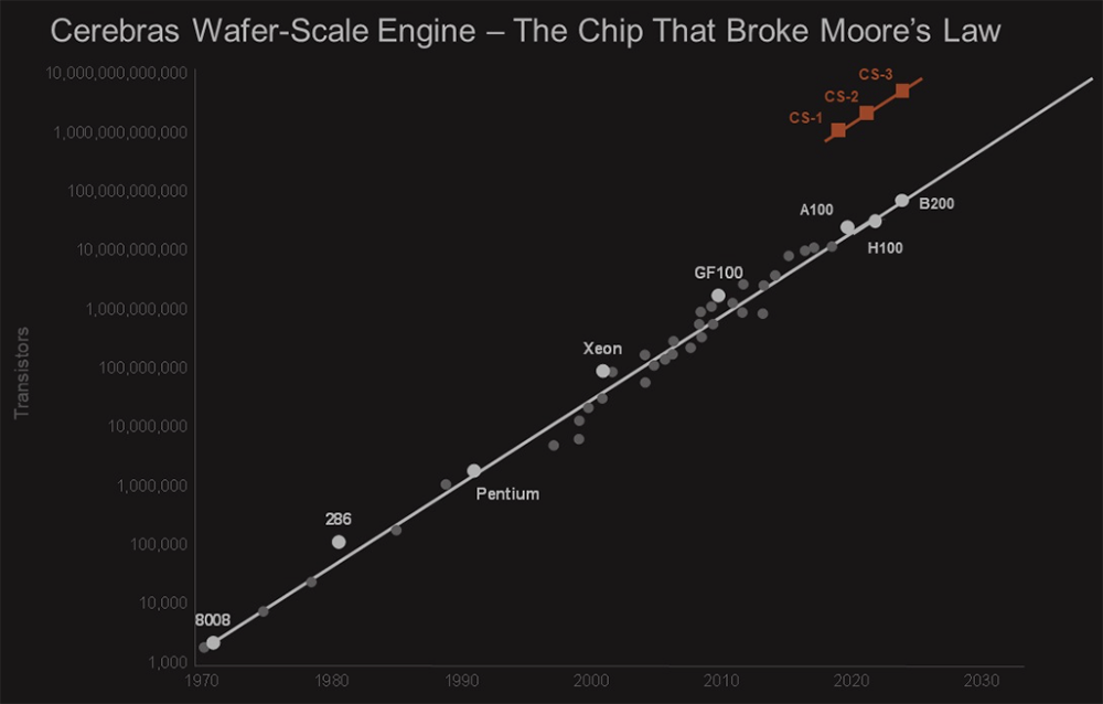 ▲白线显示了业界最大处理器芯片的摩尔定律趋势,橙线显示了Cerebras晶圆级技术创造的新轨迹