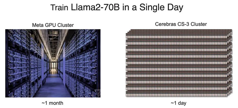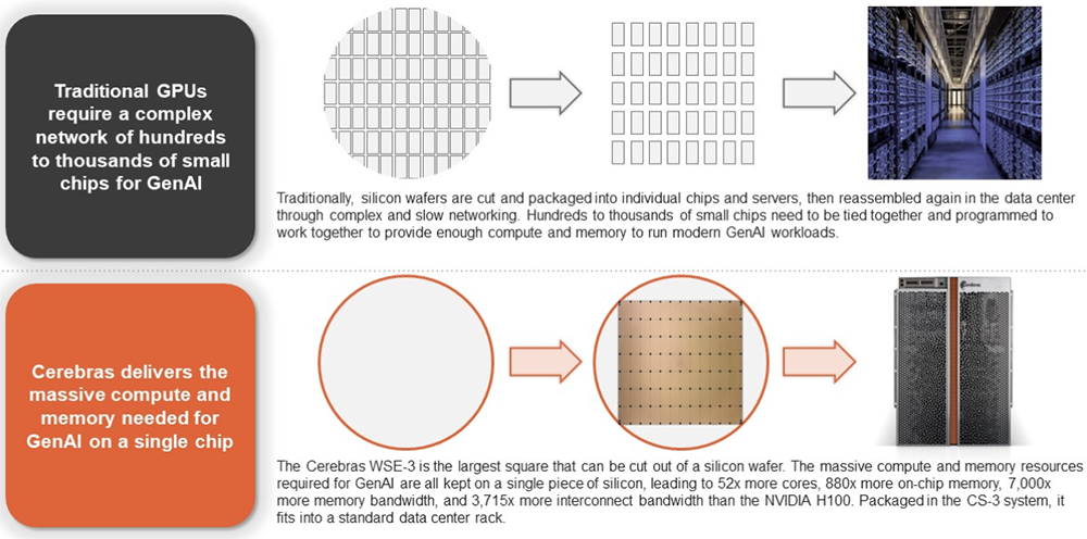 ▲Cerebras晶圆级集成与传统GPU集群集成的比较