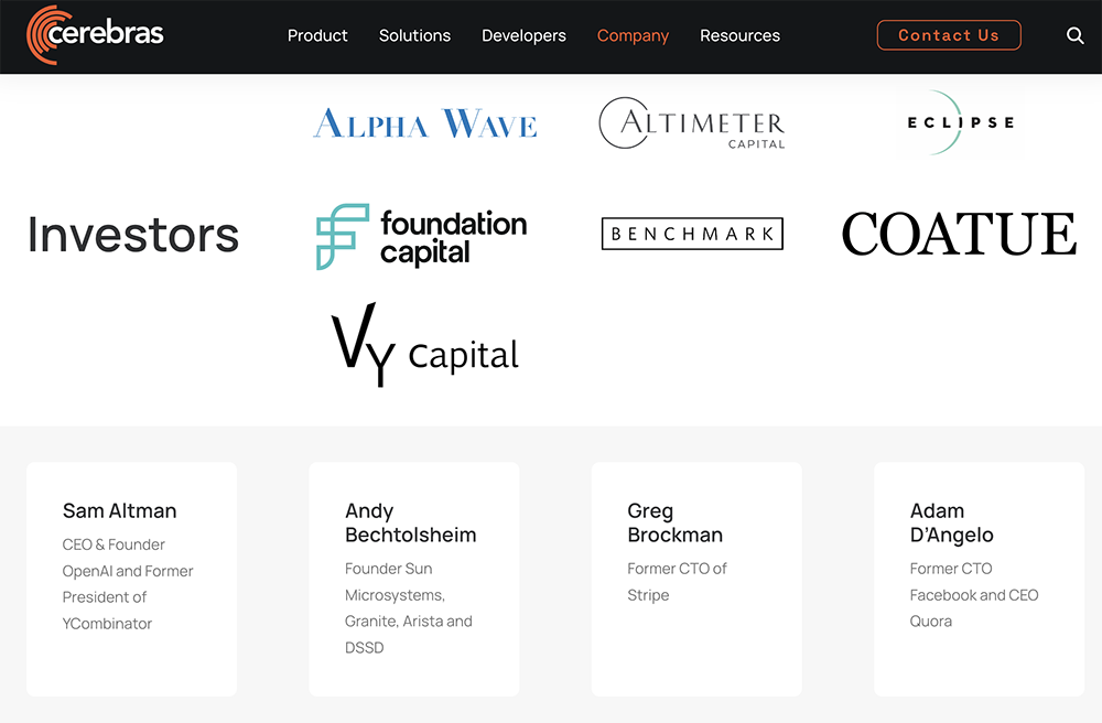 Cerebras的最大外部投资者是风险投资公司Foundation Capital,其次是Benchmark和Eclipse Ventures,Alpha Wave、Coatue和Altimeter也各自拥有至少5%的股份。