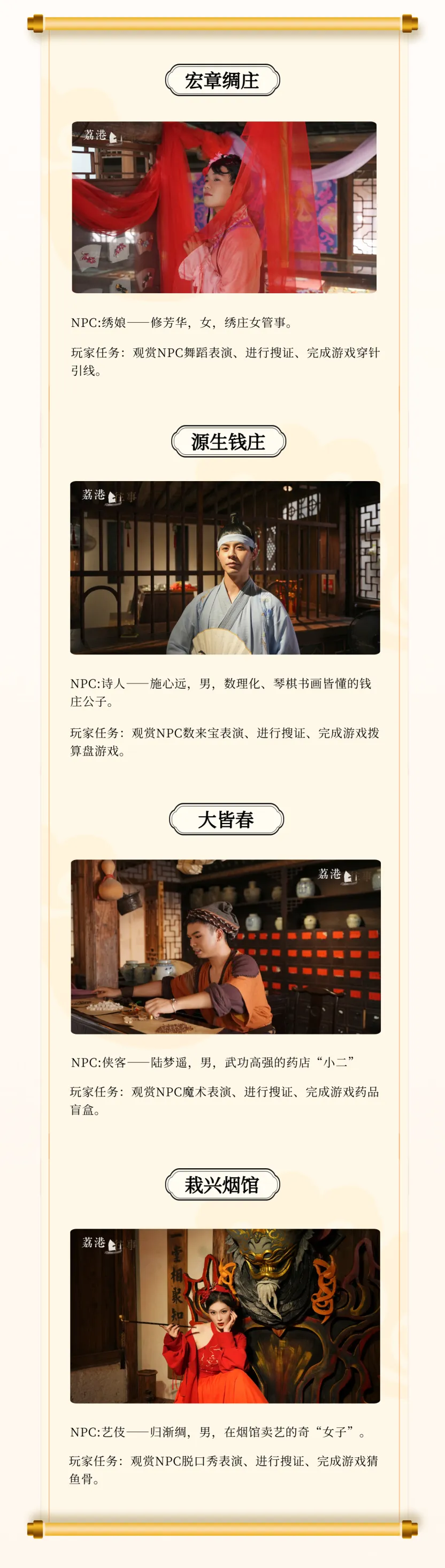 四个沉浸式场景,横跨渔港古城街区剧本杀、搜证推理、脱口秀、角色扮演,精彩不断,解密、答题、互动送礼一刻不停,绝对让你不虚此行!