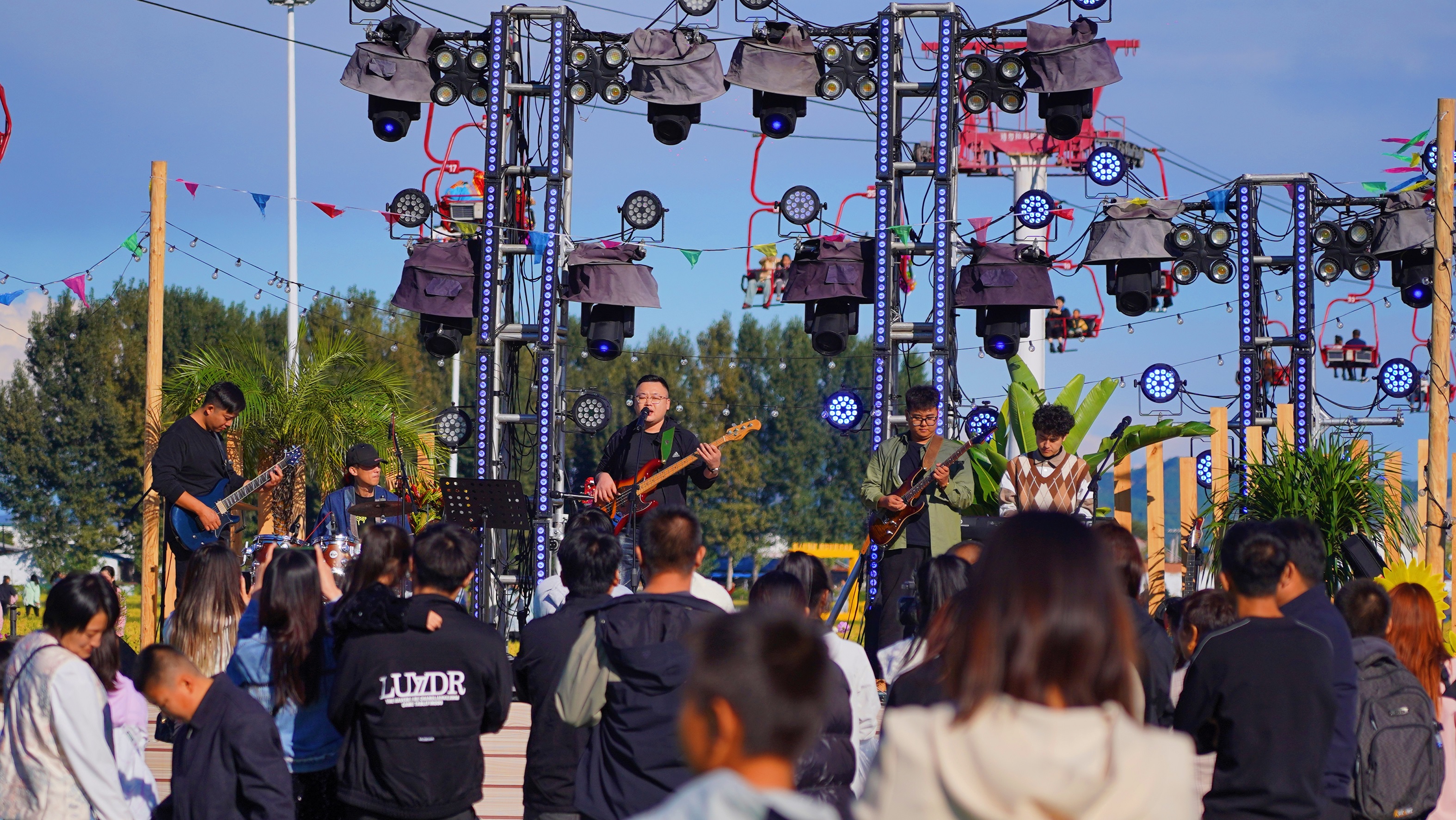 山里各庄景区推出英歌舞、打铁花、舞狮等非遗演出活动,让游客充分感受中华优秀传统文化的无限魅力。英歌舞表演舞出震撼人心的力与美,让现场游客大呼过瘾。打铁花演出则绽放万点星辰,溅起遍地银花,赢得现场如潮般的喝彩声。作为山里各庄景区国庆系列活动的重头戏,摇滚音乐会汇集了河北卫视原著名主持人大刚、张杰,著名音乐歌手刘嘉伦,优秀青年歌手田宇恒以及派森乐队、光年乐队,让激昂的音乐在田野间回荡,点燃游客内心的激情。位于夕阳谷区域的恐龙展则为游客带来了更多惊喜。