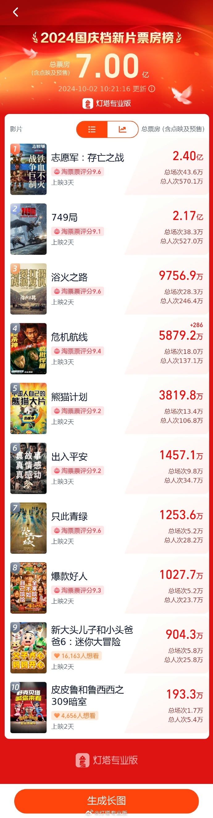 据灯塔专业版,截至10月2日10时21分,2024年国庆档新片票房(含点映及预售)突破7亿。