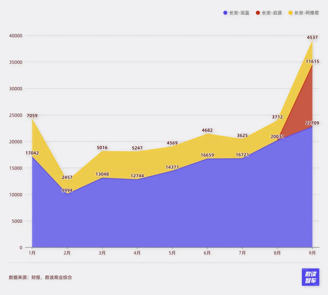深蓝是长安较为强势的旗舰品牌,本月,深蓝继续延续势头,月销22709台创造历史新高。在深蓝之外,启源的表现成为长安的又一个亮点。长安在本月首次披露启源的数据。这个2023年成立的品牌,9月销量达到11615台,表现非常亮眼。如果启源销量能够保持,长安将在深蓝之外又拥有一个月销过万的品牌,为新能源业务线带来巨大的助推。