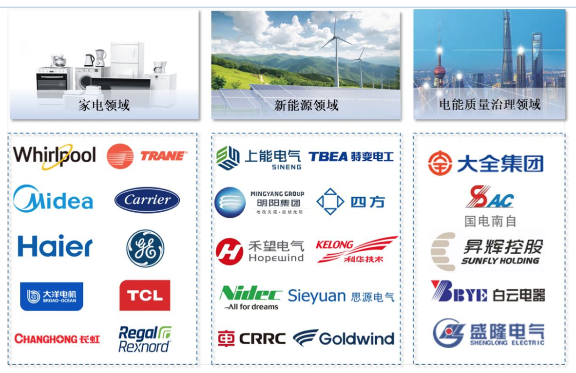 公司是一家专业的薄膜电容器企业,为全球知名设备企业提供电机电容器、电力电子电容器和电力电容器等产品。薄膜电容器的主要应用领域包括家用电器、光伏风电、新型储能、新能源汽车、高压SVG、工业控制、轨道交通、电能质量治理等。服务客户包括家电领域的美的集团、惠而浦、美国特灵、开利集团、海尔集团、通用电气和TCL等;新能源领域的上能电气、金风科技、远景能源、科华数据、明阳集团、四方股份、禾望电气、尼得科、中车时代电气、思源电气和特变电工等;电能质量治理领域的大全集团、国电南自和白云电器等。