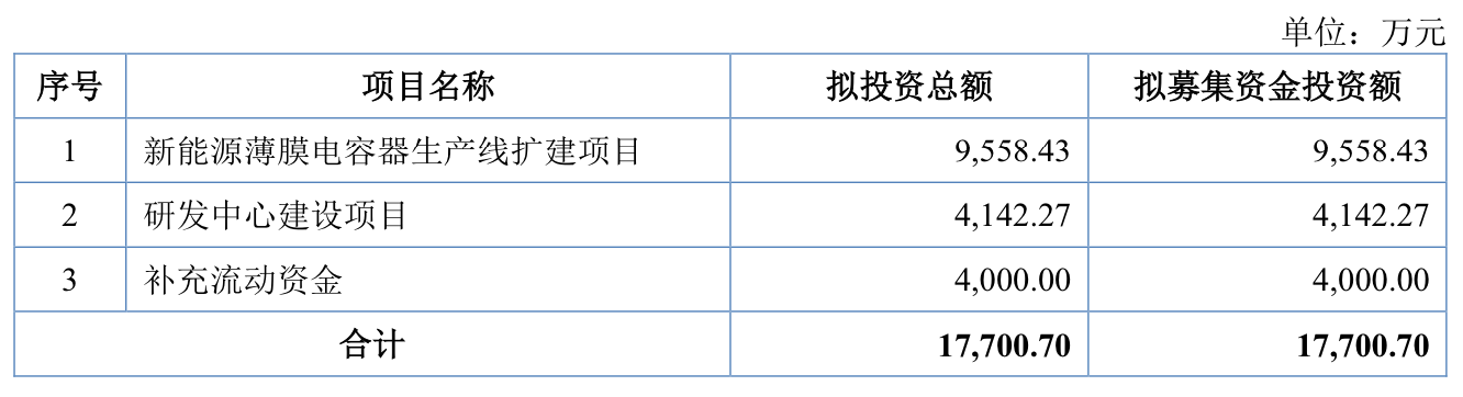 值得注意的是,这次胜业电气计划募资额为1.77亿元,“新能源薄膜电容器生产线扩产项目”拟投9558.43万元,研发中心的建设以及补流各分配4142.27万元和4000万元。